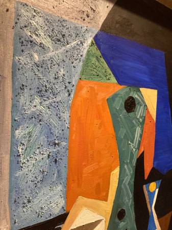 Offered is an oil (acrylic?) painting on canvas in the cubist / abstract style of Pablo Picasso. No signature is visible. Probably dates to late 1970’s.