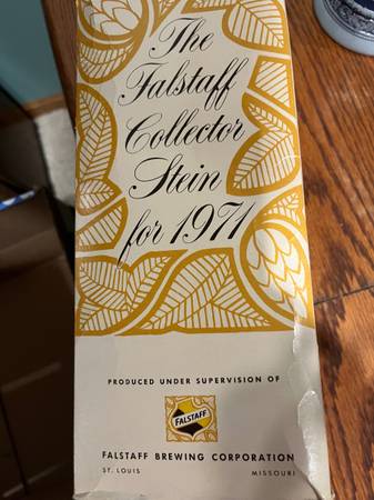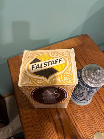1971 Falstaff could collector’s beer stein. 9” tall. Replica of an original Westerwald stein. Includes original box.
