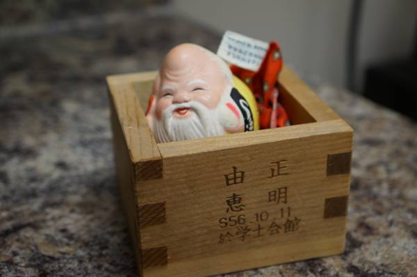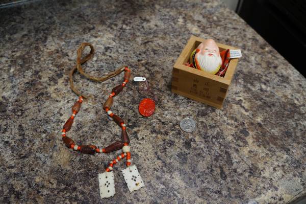 This is a small lot of Asian antiques, including a bakelite charm and necklace, a small figurine of a round man, a wooden box, and a silk scarf. The whole lot for $5! Cash only please! Pick up at...