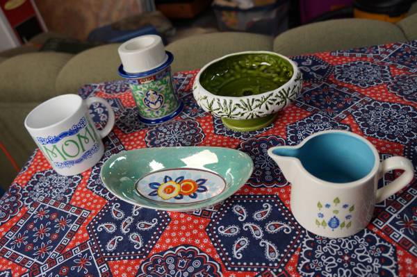 Various pieces of blue and green vintage glass in good condition. $5 each or $20 for all 5! The candle holder and green pedestal dish are from Japan. Cash only please! Pick up at the Casey's at 96th...