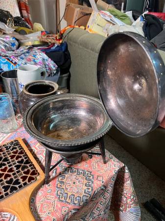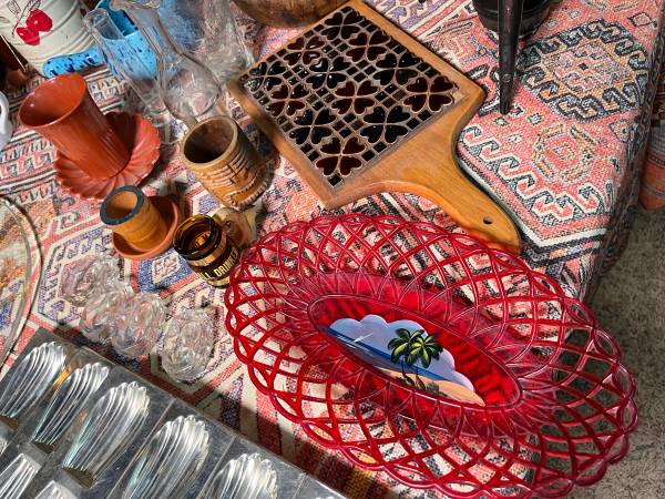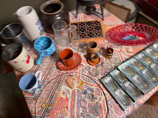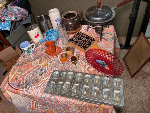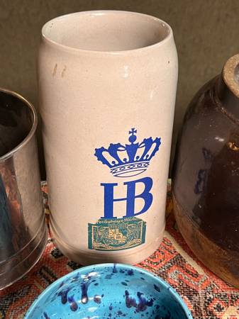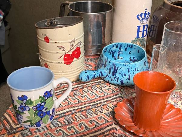 This is a collection of various antique household goods, $20 takes it all!!! Mugs, German beer stein, handled crock jug, made in Germany floral glass tray, clamshell mold trays, antique tin flour...