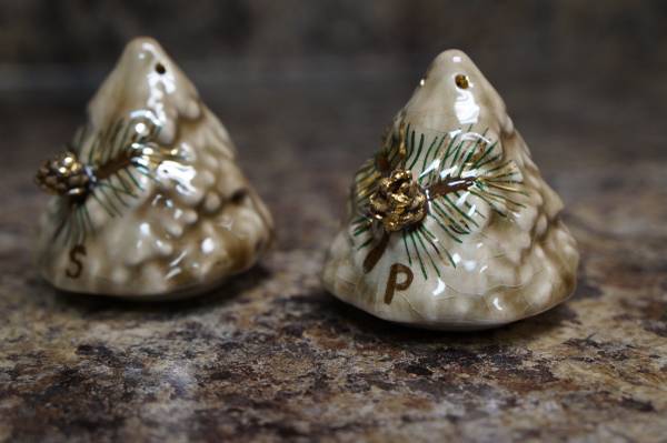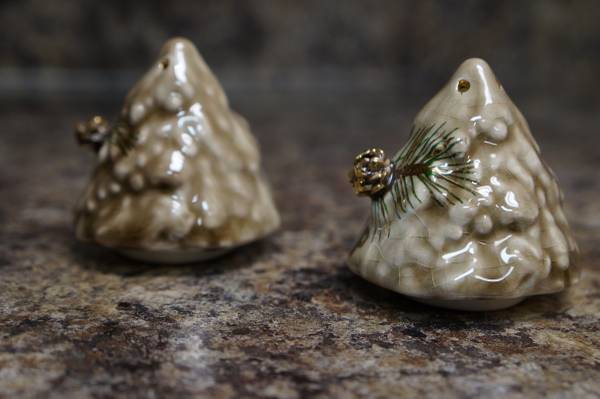 Snowy pine tree Salt & Pepper shakers + Atomic christmas tree dish -...