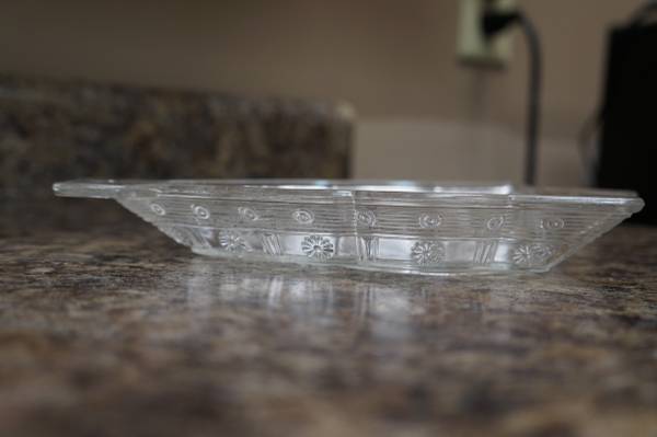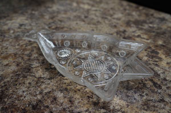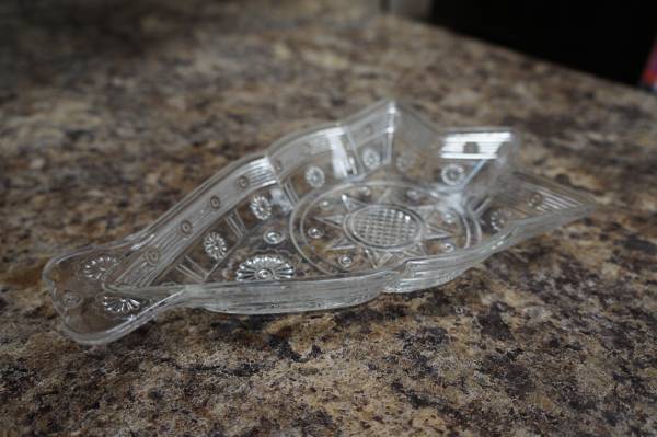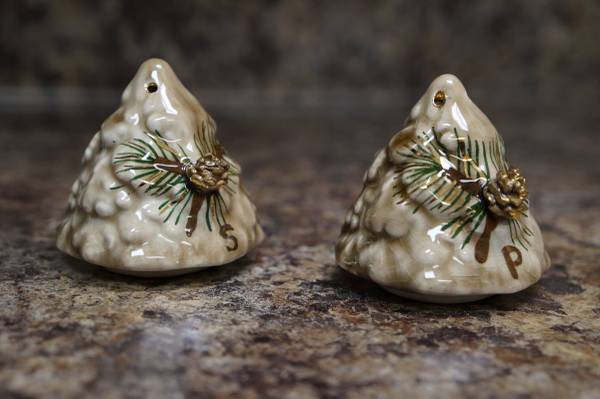 This is a beautiful little Salt & Pepper shaker set of snowy pine trees with golden pinecones! Also included is an atomic motif Christmas tree dish! Just $5 for the lot! Cash only please! Pick...
