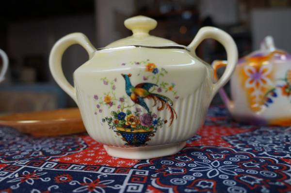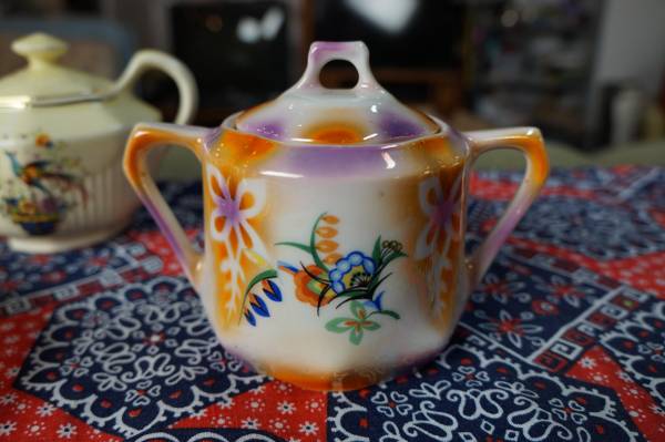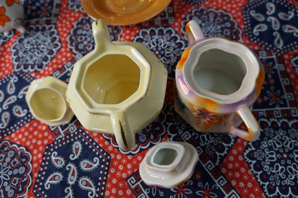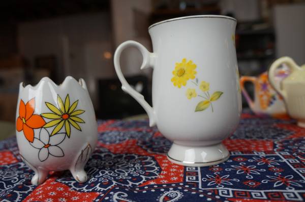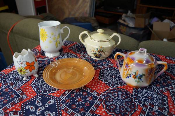 Various pieces of vintage glass, $5 each or $20 for all 5. Iridescent plate is by Fire King. Purple and orange sugar dish is from Germany. Gold peacock sugar dish, footed disco flower egg candle,...