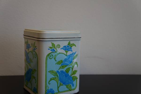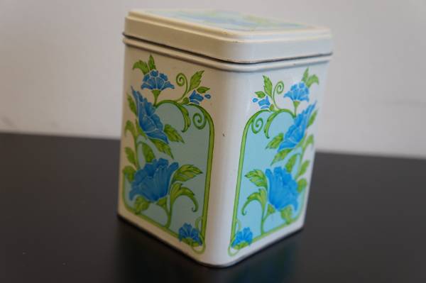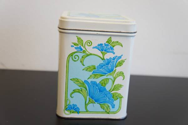 Vintage 70's-80's tin I believe from Hallmark with a blue flower motif on all sides. Maybe 6" tall or so, in excellent condition! Just $5! Cash only please! Pick up at the Casey's at 96th and Giles.