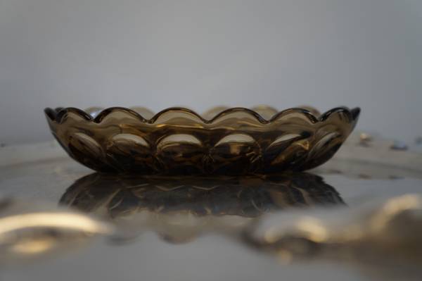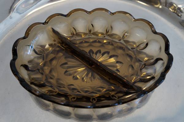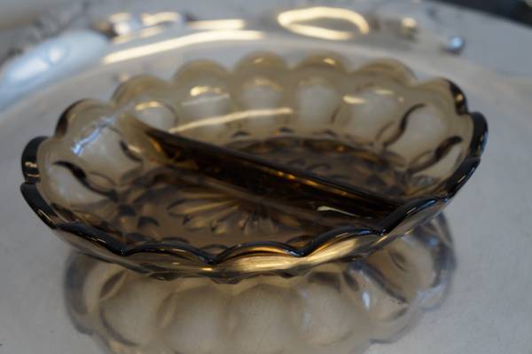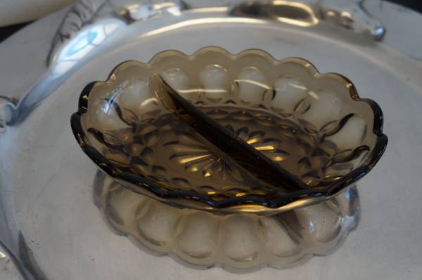 This is a gorgeous smokey glass two-chambered glass dish in excellent condition. Maybe 10" or so long. Cash only please! Pick up at the Casey's at 96th and Giles.