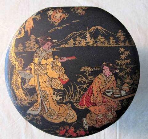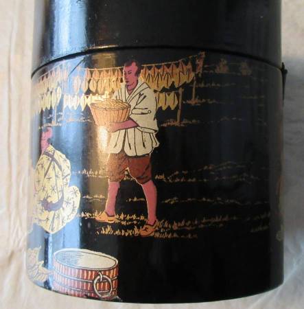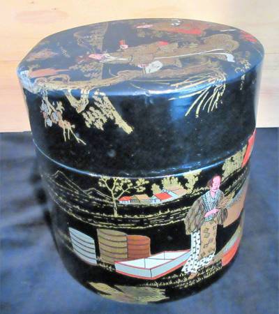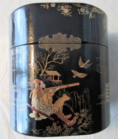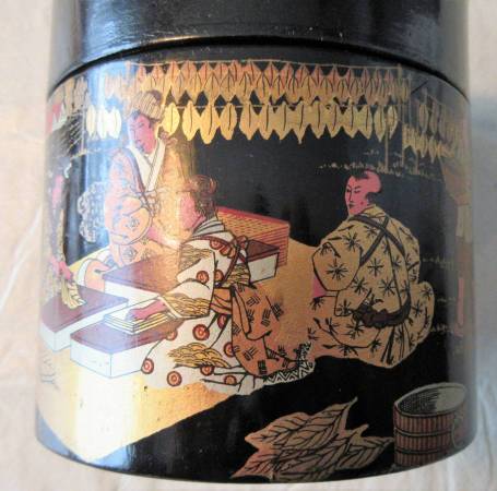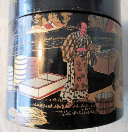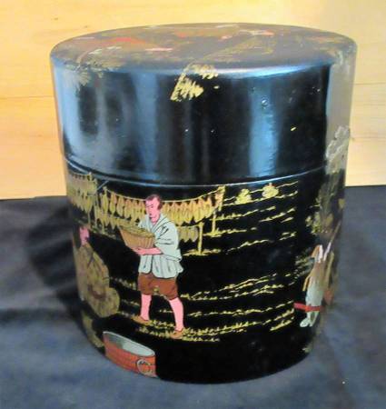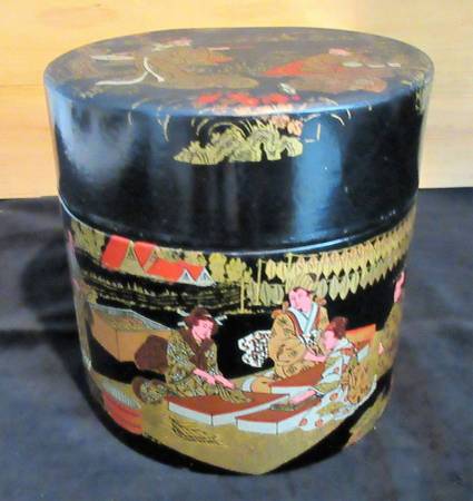 +{}+This vintage Japanese lacquer box measures 5-1/2" high x 5-1/2" in diameter +{}+Composition may be wood or paper mache +{}+The hinge is firmly attached and not sprung +{}+Vivid Japanese scenes...