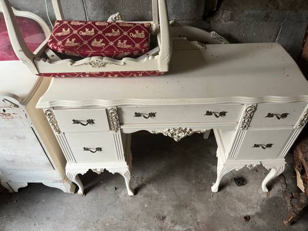 The bed set and vanity are in good shape. The old chair is sturdy and cool, and would look great if it was restored. I'm selling these items as part of a downsizing effort.