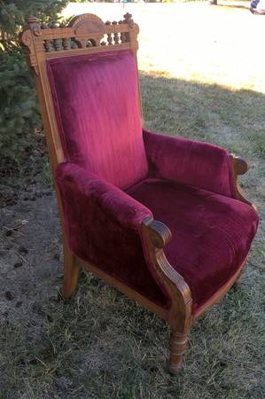Attached cushions covered with burgundy cranberry color velvet upholstery fabric