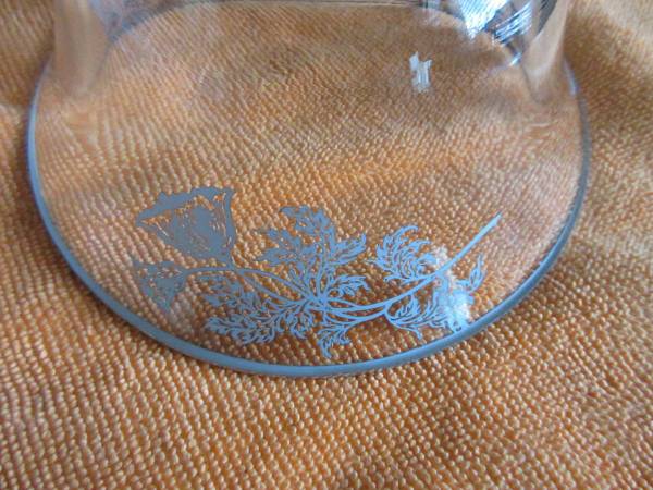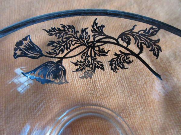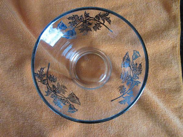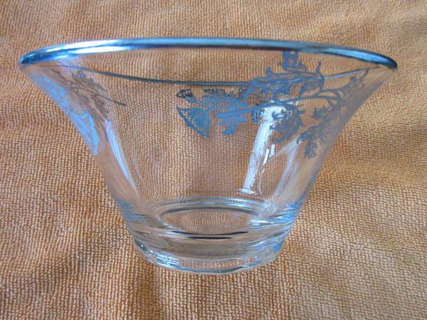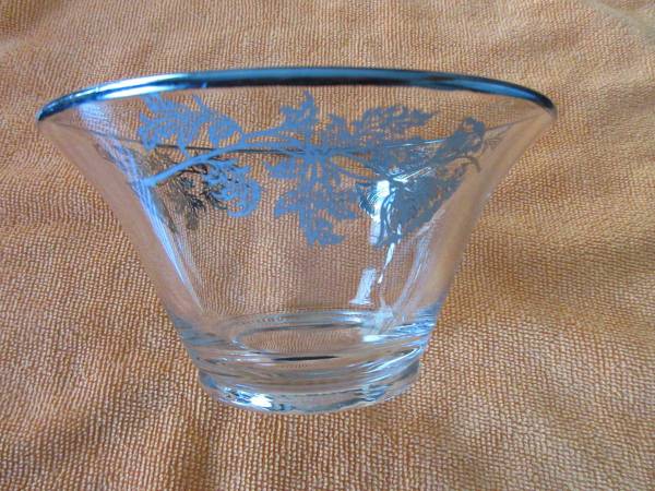 *+*This older glass bowl is silver-trimmed with the vintage poppy pattern *+*It measures 5-3/8" at the top tapering down to a 2-5/8" base; 2-7/8" high *+*An elegant serving bowl or candy dish *+*No...