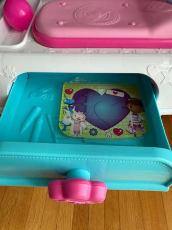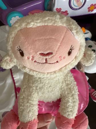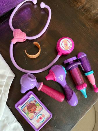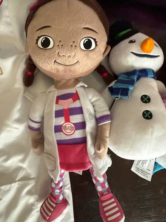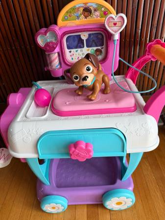 Doc MscStuffins toys, good-very good condition. Please see photos. A couple scuffs on cart and doctor bag, slight wear on a couple plushies and a couple tiny spots on Chilly’s face