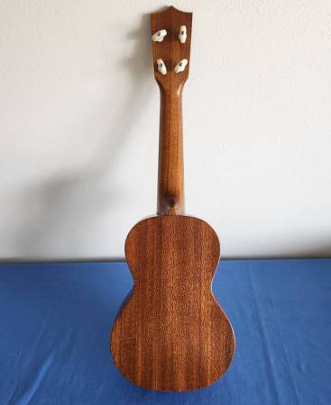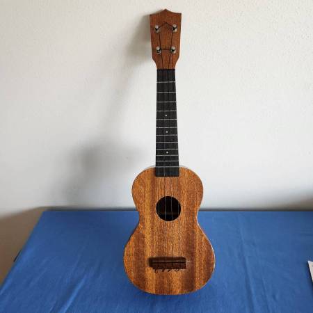 This is a vintage, c. 1960s, Japanese-made soprano size Hudson model HU-10, similar to the Kiwaya/Famous brand ukulele in good condition. The instrument is made of mahogany and is approximately 21 inches in length with a black fret board. There is no name stamp or interior label on the ukulele, but the original box is marked HU-10. The four-string tuning pegs are located on the back of the headstock. Also included is a 1950 Four-chord Uke Instruction Booklet with songs and cords.
