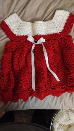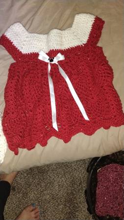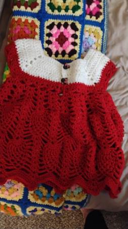 This is a hand crocheted Christmas dress with Minnie, mouse buttonst, and ribbon on the front with a Minnie mouse button that is a decoration in the middle of the the bow the dress is a size 4 toddler crocheted by me the creator of