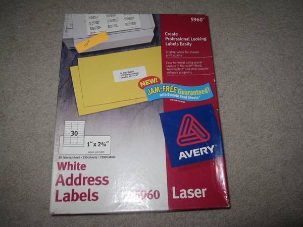 WOW! New white address labels Avery Jam-Free with smooth feed sheets. 5960 Laser box of 7,500. A GREAT BUY!