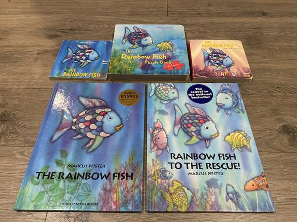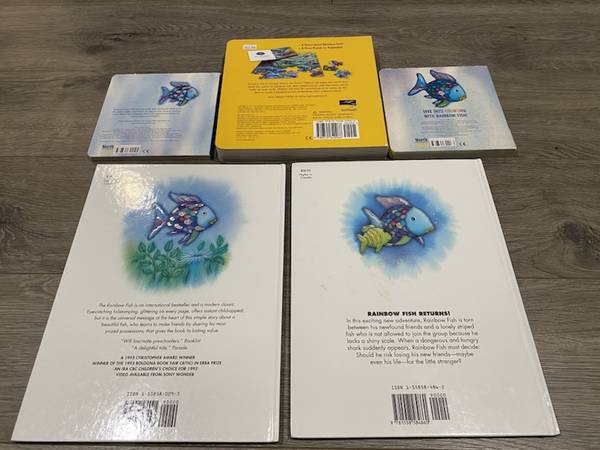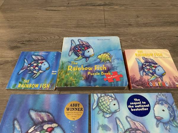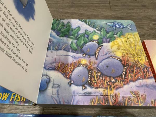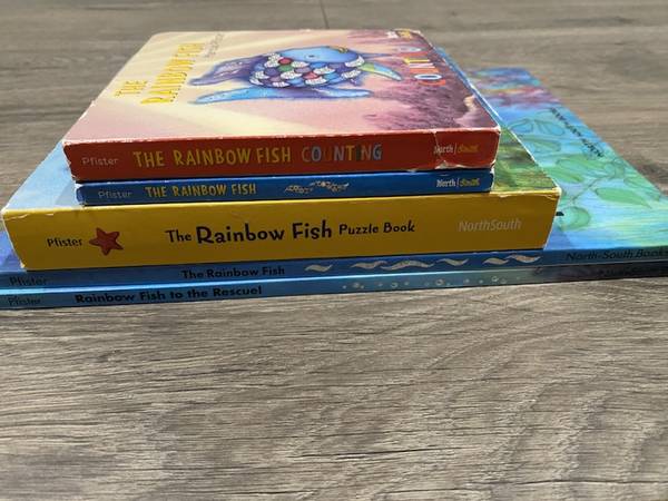 ♥ ♥ ♥ THE RAINBOW FISH by Marcus Pfister 2 Large Hardcover Books 2 Board Books 1 Puzzle Board Book with 9 Puzzles Pick up 192nd & Harrison area Text