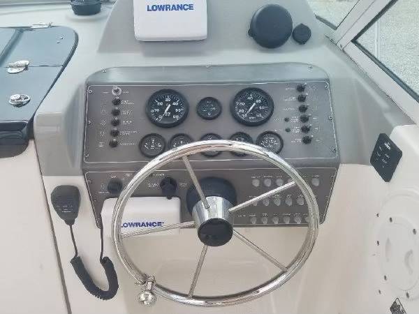 Lowrance HDS 5 GPS/Plotter and VHF Radio — Navigation and communication ready.