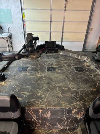 • Electronics: Features a Humminbird Helix 10 at the bow and a Lowrance Hook at the side console.