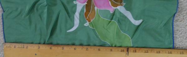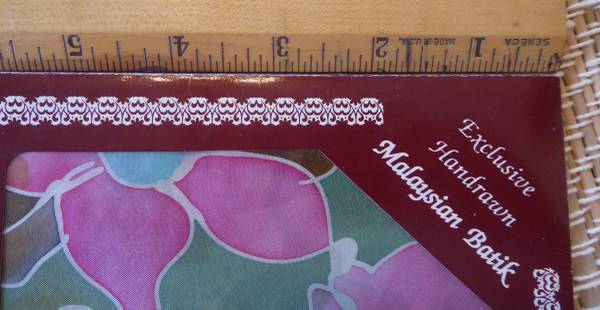 Here is a scarf, or handkerchief from Malaysia. It is silk, hand drawn, hand painted Batik. Unknown brand, unknown year of manufacture. It measures 14" by 14". Has never been used. In original...