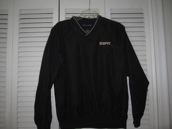 SZ small Devon & Jones Black V- neck sweat shirt type pull over ESPN Logo, LIKE NEW - from home of no smokers or pets. Send your phone number if interested.