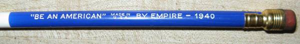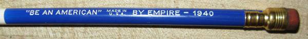 [=.=]This patriotic pencil has NEVER BEEN USED; original factory point and eraser [=.=]Stenciled: "BE AN AMERICAN" MADE IN U.S.A. BY EMPIRE - 1940 [=.=]A great find for the collector of vintage...