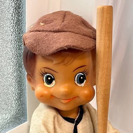 From the 50s or 60s. Excellent condition. Face is rubber; bat is wooden. Only stays in the seated position and is 7". 12" long overall.