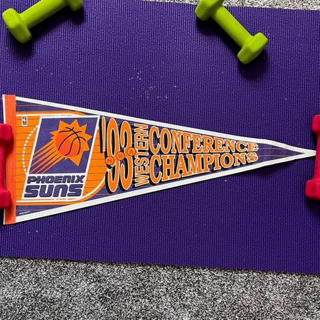 -1993 Western Conference Champions pennant. I got for Xmas when I was a kid so I think we had to roll to get on the airplane. However, the colors are still perfect and no fading.