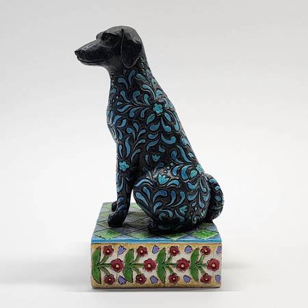 The product is a 2005 Jim Shore “Heartwood Creek” figurine (item # 4004854) is 7 ¾” tall; no box. The name of the dog figurine is “Licorice”. This multicolor resin figurine, part of the Jim Shore collection, features a country style and depicts a black labrador as its subject. Perfect for any room and occasion, this figurine captures the essence of dogs in a charming and detailed design.
