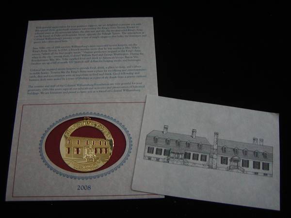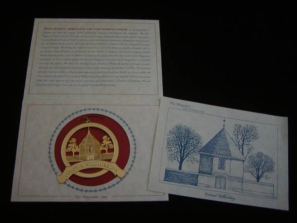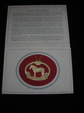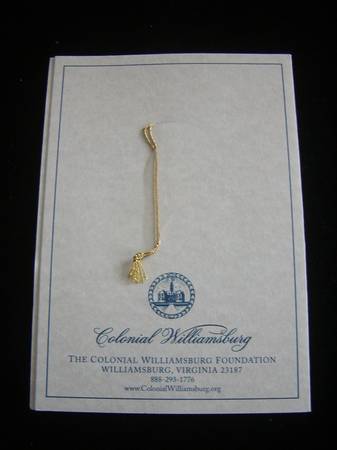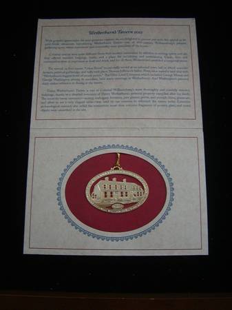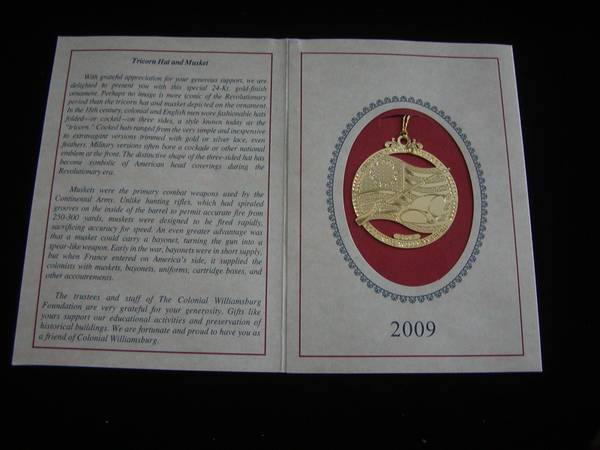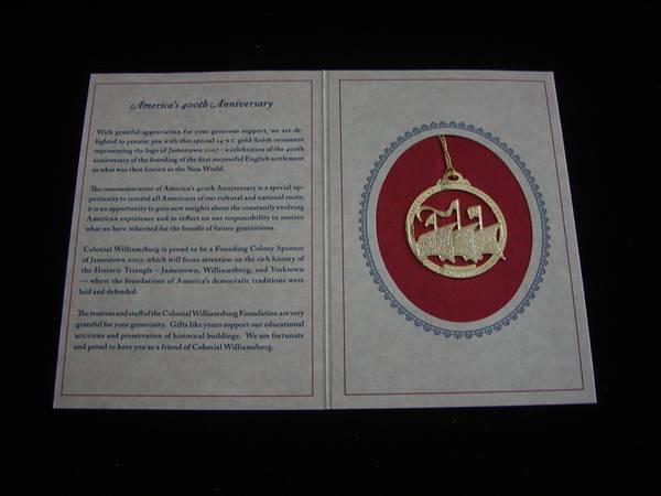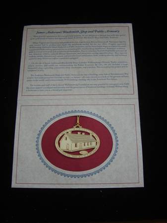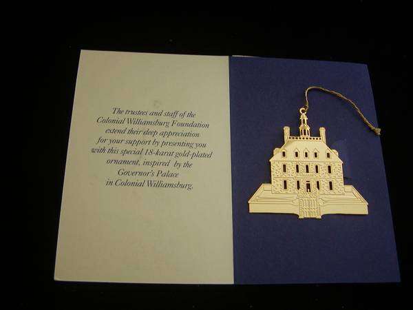 Each ornament is gold-plated, carefully crafted in the United States, and comes in their original card describing the historical significance the showcased ornament played in the colonial history of the United States in Williamsburg, Virginia. Sizes vary slightly but no larger than approximately 2" W x 2" L. Comes with a gold cord for hanging. $5 for all 22 ornaments.