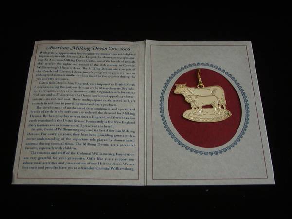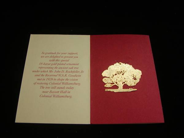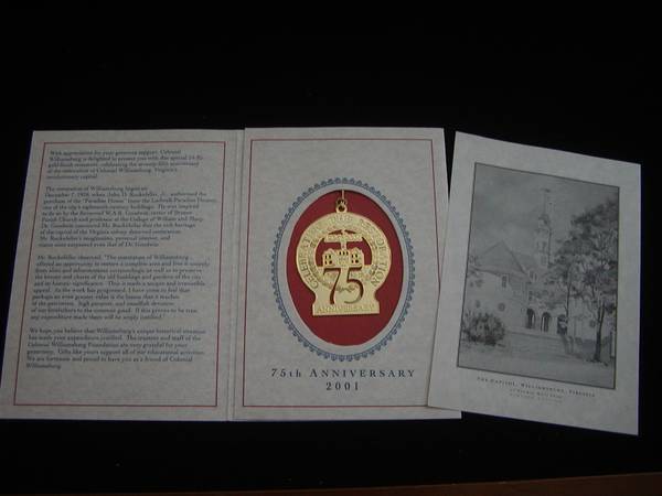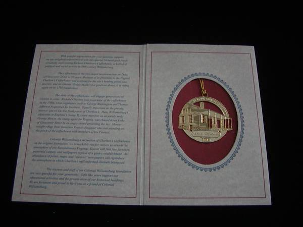 Keep the legacy of our nation’s birthplace and American history alive with these timeless Colonial Williamsburg Foundation Christmas Tree Ornaments. These exclusive ornaments were presented only to those who made generous donations to the Colonial Williamsburg Foundation for their research, conservation and historic support for the restoration and preservation of the former colonial capital.