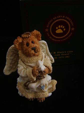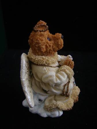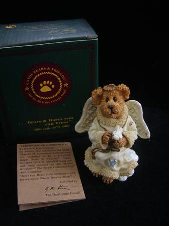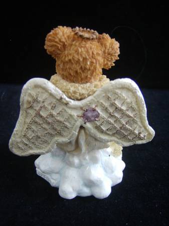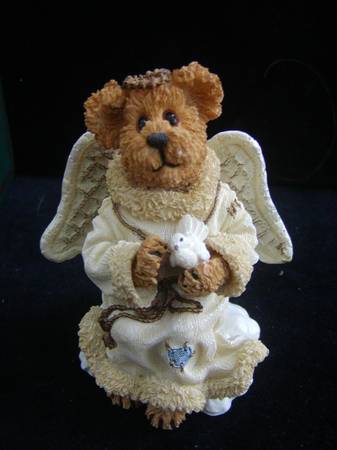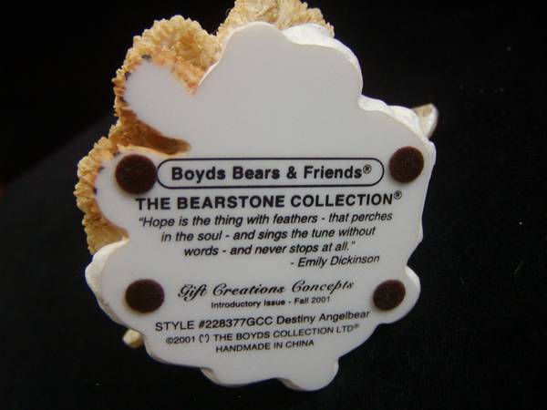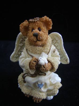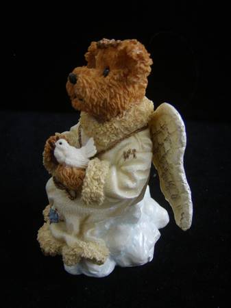 This Boyd’s Bearstone collectable features an angel teddy bear with a halo and wings holding a small white dove, made of cold-cast resin, is very detailed, measures 3.5” H, comes with original box and certificate of authenticity.