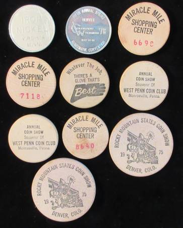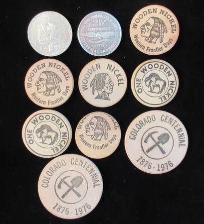 [=]An eclectic assortment of wooden and iron nickels [=]Earliest is a 1958 centennial nickel from Virginia, Minnesota [=]Latest is a 1976 iron nickel from Denver [=]Most are undated [=]Cash only,...