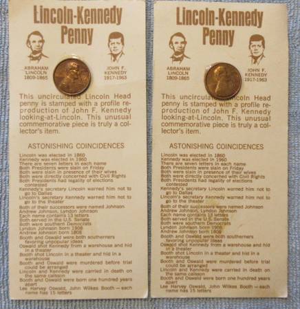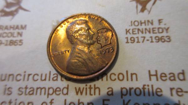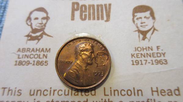 [=]An uncirculated 1973 Lincoln Cent is affixed to a 2-3/4" x 6" card [=]The memorial cent is stamped with Kennedy's profile [=]Below the cent are a number of astonishing Lincoln-Kennedy...