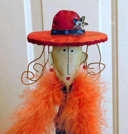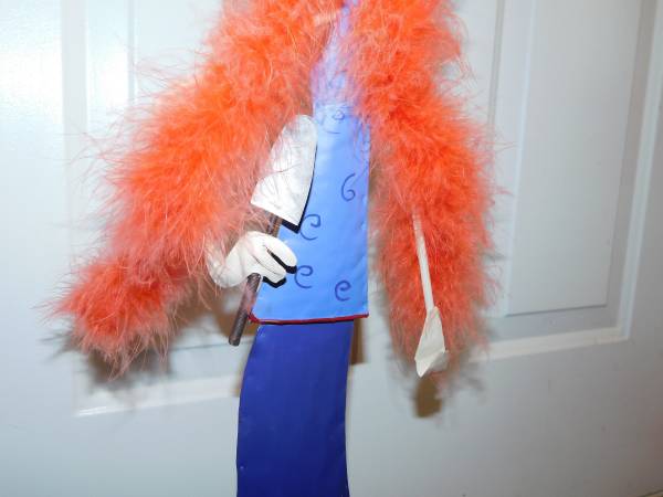 She wears a purple dress with a red hat, red feathery boa and red shoes.