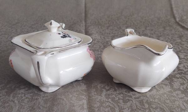 - - - - Measurements approx: SUGAR BOWL 3” tall without lid. Lid is about 1 ¼” tall. 6 ¾” long from handle-handle X 5 ¼” wide. - - CREAMER 5 ¾” long from spout to handle. 3” tall X 4 ½” wide. “424” in silver tone on bottom of creamer.