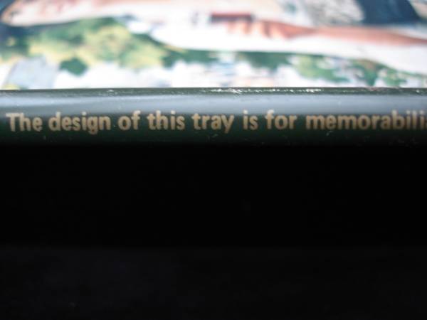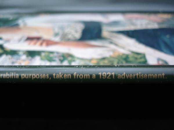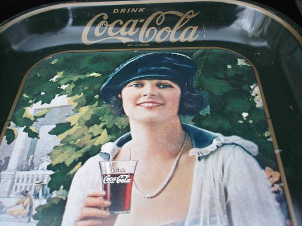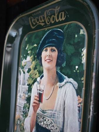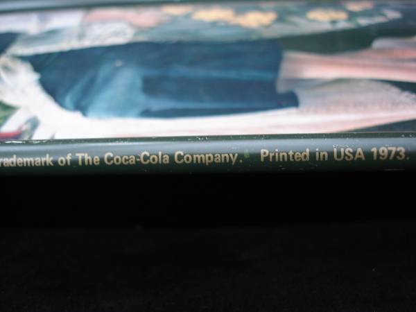 This Coca-Cola tray measures approximately 8.5” W x 19” H, is dark forest-green with gold-colored trim, and portrays a girl in a green dress with a white sheer overlay, and green beret-style hat drinking Coca-Cola . Printed on the rimmed-edge of the tray reads…The design of this tray is for memorabilia purposes, taken from a 1921 advertisement. Coca-Cola is a registered trademark of The Coca-Cola Company. Printed in USA 1973. Tray is in very good vintage condition with some minor wear and scratching and has a square brass hook on back for hanging.