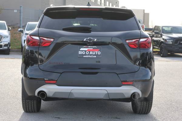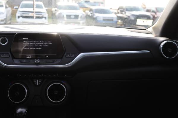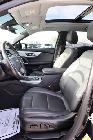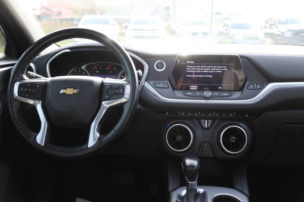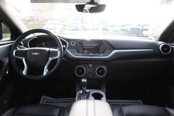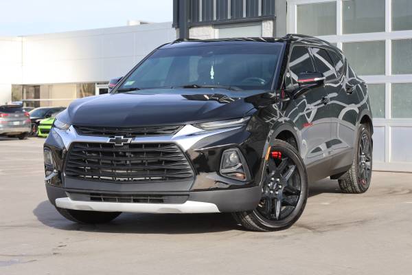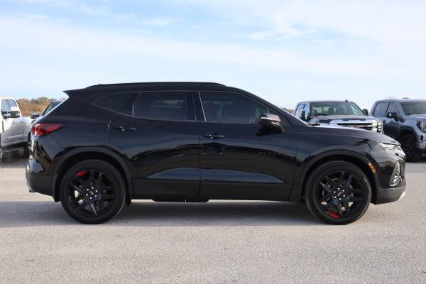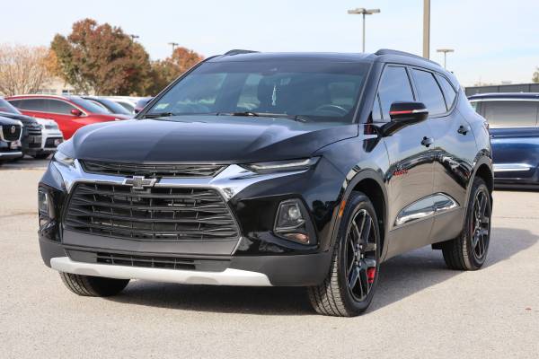Finished in a sleek Black exterior over a matching Black leather interior, this Blazer LT comes well-equipped with automatic headlights, power door locks, power windows, power side mirror adjustments, power driver seat, dual-zone climate control, cruise control, infotainment system, Bluetooth connectivity, Apple CarPlay and Android Auto compatibility, backup camera, and premium alloy wheels.
