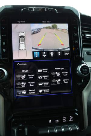 Finished in a bold Black exterior paired with a premium Black interior, this Laramie trim is well-equipped with automatic headlights, power door locks, power windows, power side mirror adjustments, heated and ventilated power front seats, dual-zone climate control, infotainment system, Bluetooth connectivity, backup camera, navigation system, cruise control, and premium alloy wheels—offering modern comfort with rugged capability.