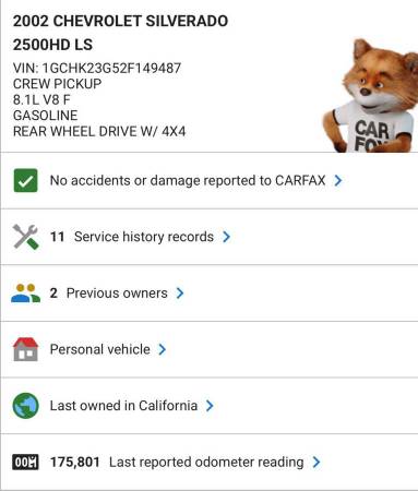 *Rust free from California since new* 8.1 V8! 4x4! Crew cab! Long bed! Allison transmission! 2002 Chevy Silverado 2500HD LS. I don’t remember the last time we had one of these! The crew cab, long bed, 4wd’s with the 8.1 are very hard to find. Especially when they’re true rust free from California! This one just go off the truck from Auburn, California today. It is fully serviced and checked over. Runs and drives perfect. No warning lights on the dash. No interior odors and hardly any wear on the interior. It’s a very well kept truck. Only two owners since new- same since 2013. No accident or damage reports and it is a clean title. Most of these trucks end up in Wisconsin, Minnesota or illinois. If you wish to purchase this truck over the phone please see the full photo gallery at: https://www.us9.biz/details/used-2002-chevrolet-silverado-2500hd/118739610 There are multiple photos of the undercarriage and fluids. There does not appear to be any leaks. The tires are ok- not new but there is a decent amount of tread left. They are Cooper Discoverer AT3’s. $1,000 non-refundable deposit required to hold for 7 days. Deposit goes towards the balance. Please call 7122598816. No payments. Thanks!