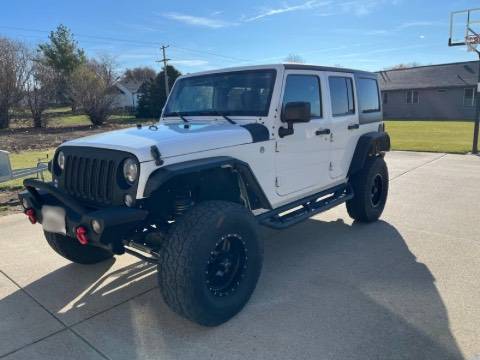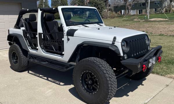 Very nice 2016 Jeep Wrangler Unlimited Sport. Several tasteful aftermarket mods including matching steel textured bumpers, fenders, and running boards, 3" Rough Country lift kit, double front stabilizer, 35" tires with black rims, Alpine stereo with backup camera, and textured steel half doors for summer. The vehicle is in great shape inside and out. We have leather seat covers in it but the original cloth seats are in new condition and a full set of Weather Tech floormats come with it. All mods listed above other than bumpers are less than two years old.