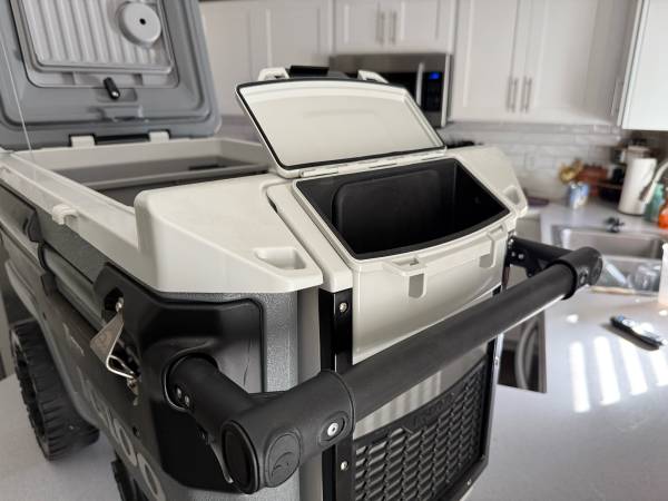 Four self-draining cup holders in the lid keep your drinks secure & within reach