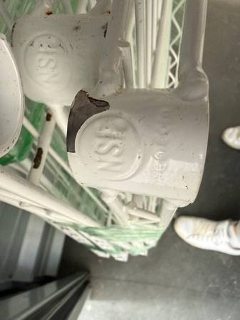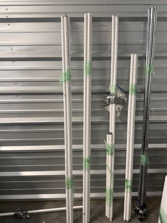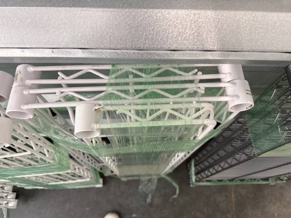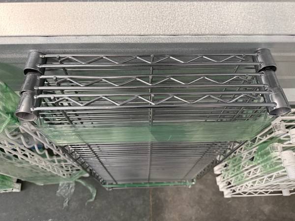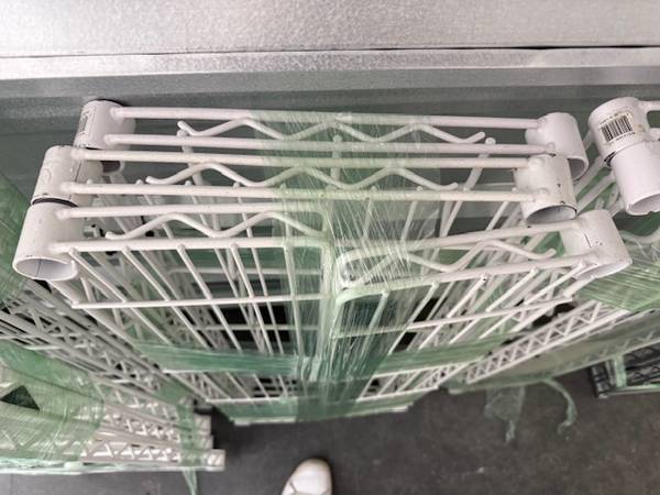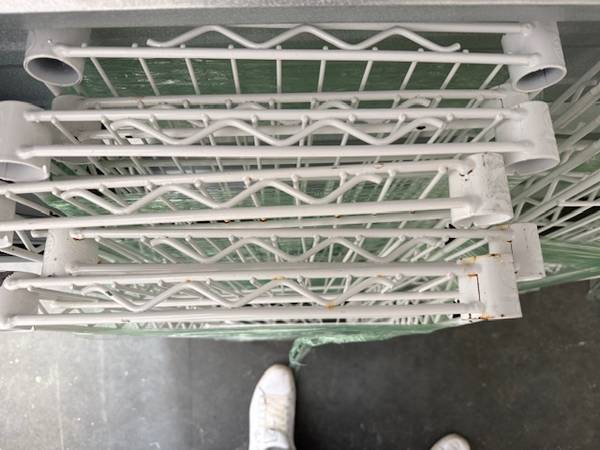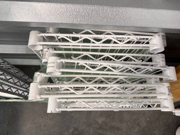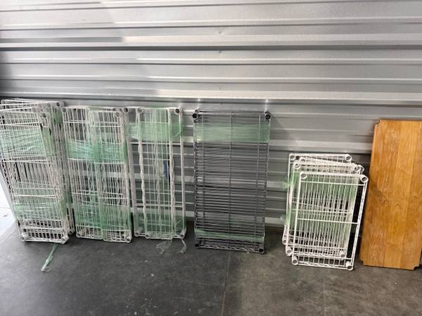 InterMetro wire shelving and posts purchased from The Container Store, pieces and dimensions below. The shelving is industrial quality with some scratches. Piece counts/dimensions below. The items are in a temperature controlled storage unit and must be picked up by buyer.