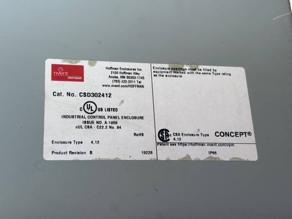 Hoffman Electrical Enclosure CSD302412 with backing plate Measures 30” x 24” x 12” See pics for knockouts.