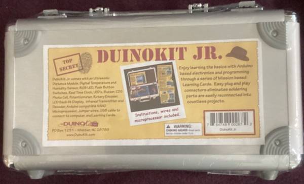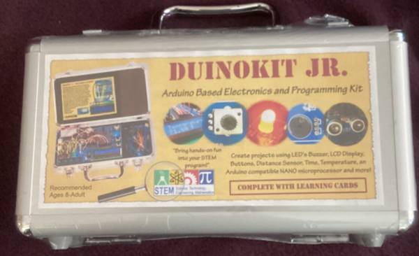 DuinoKit Jr. comes with an Ultrasonic Distance Module, Digital Temperature and Humidity Sensor, RGB LED, Push Button Switches, Real Time Clock, LED's, Buzzer, CDS Photocell, Potentiometer, Rotary Encoder, LCD Back-lit Display, Infrared Transmitter and Decoder, Arduino compatible NANO Microprocessor, Jumper wires, USB cable to connect to computer, and online missions and challenges for learning.
