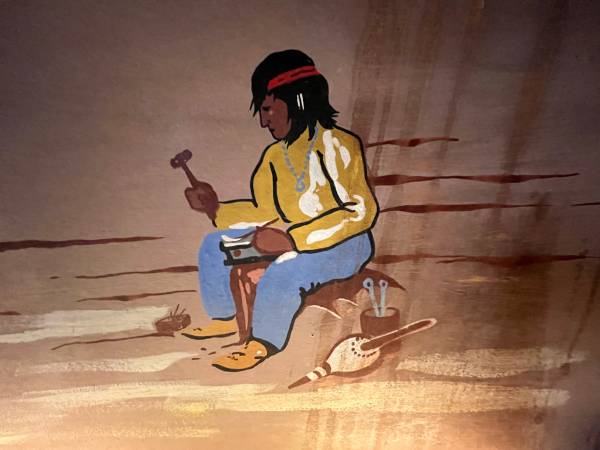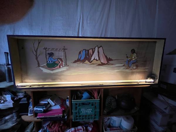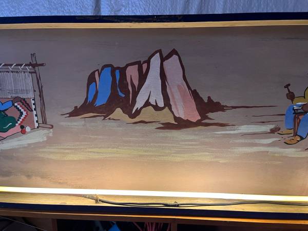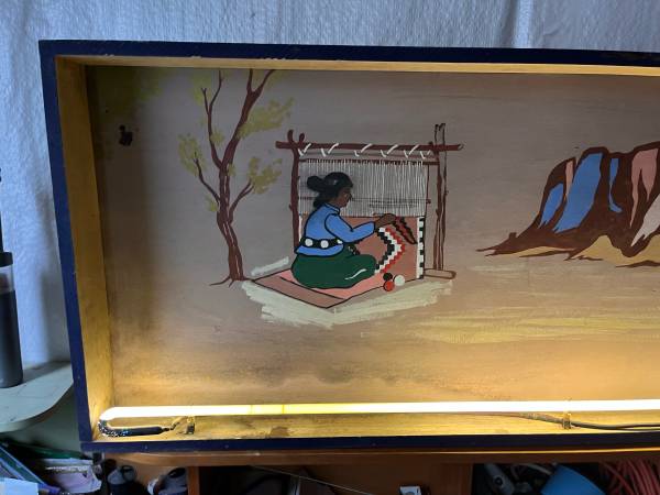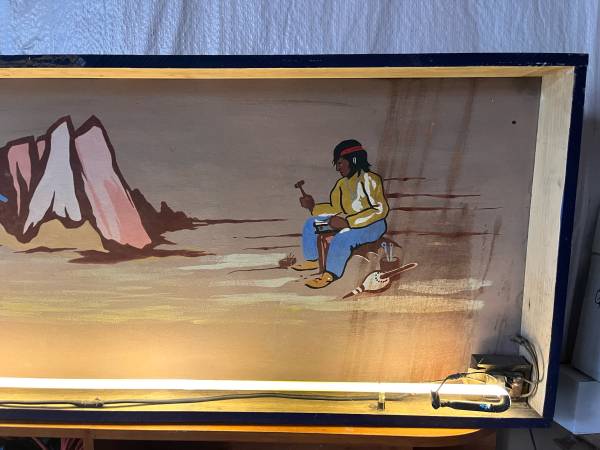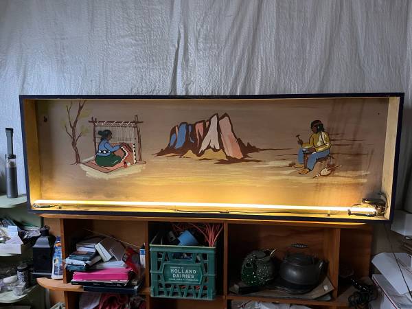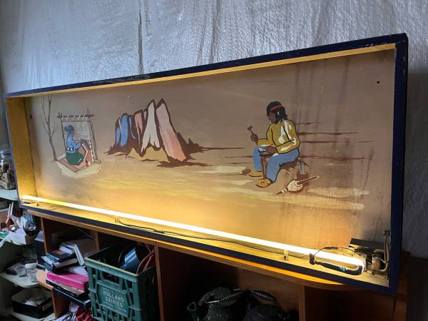 This is an interesting hand painted box sign with neon light. It is in unrestored condition, could use an updated power cord and cleaning, but is in working order as is. Not sure of the origin or the sign, it was purchased at an auction in downtown Omaha.