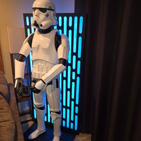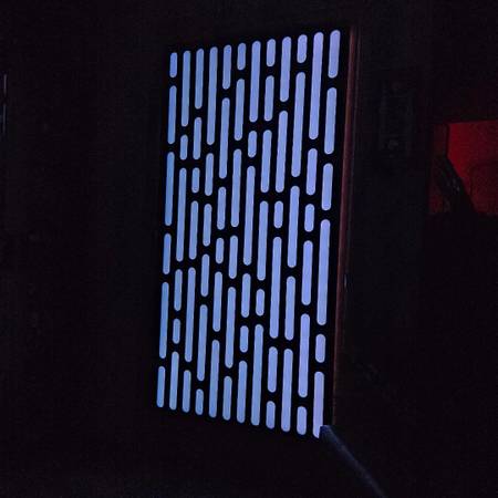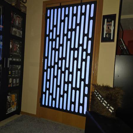 A must have for all Star Wars Fans! Star Wars Death Star Light Panel Wall. Approximately 3' X 6' . Bluetooth or remote controlled with multiple color combinations, light patterns, multi brightness levels, sync to music or create your own color combinations. Easy wall installation with just two screws. Solid wood frame with sturdy double plastic light filtering. Perfect for Star Wars Fans, Sci-Fi Fans or even in your home theater area or just for mood lighting. Brand new custom built.