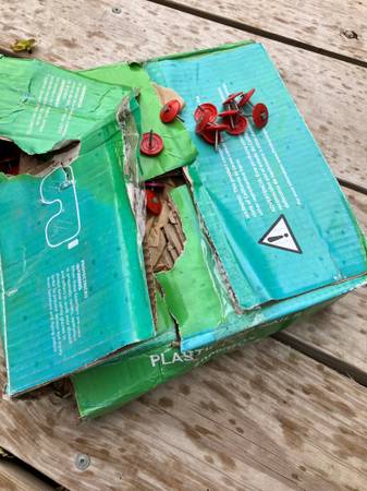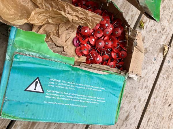 Selling a new box of 2,000 generic Plastic RED Cap 1” long ring shank nails for use with securing roofing underlayment / felt paper. Box has some shelf wear.