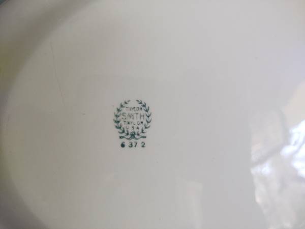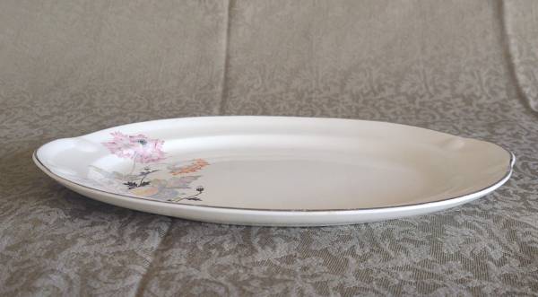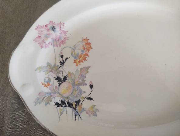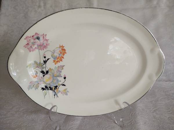 - - - Discontinued pattern made by TS&T, Taylor Smith & Taylor. Circa 1934. - Cream background, beautiful colored flowers, silver tone trim. Trademark on back. - - - Measurements approx: 11 ½” overall length. Width: 8 ¼” - - - Vibrant flowers including thistle, leaves, flowers, stems. Pink, orange, black, blue, gray, green and more.
