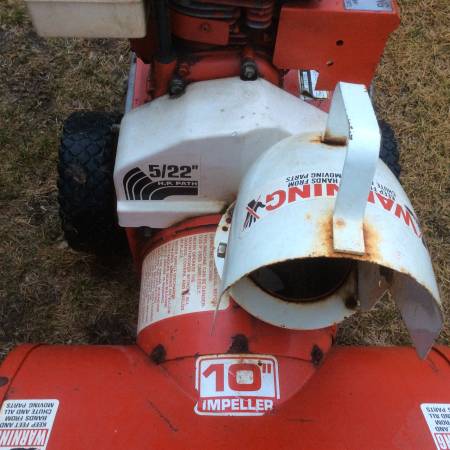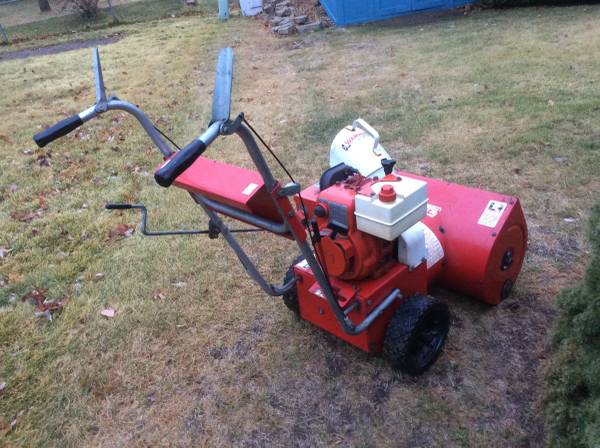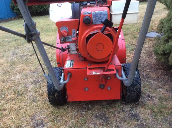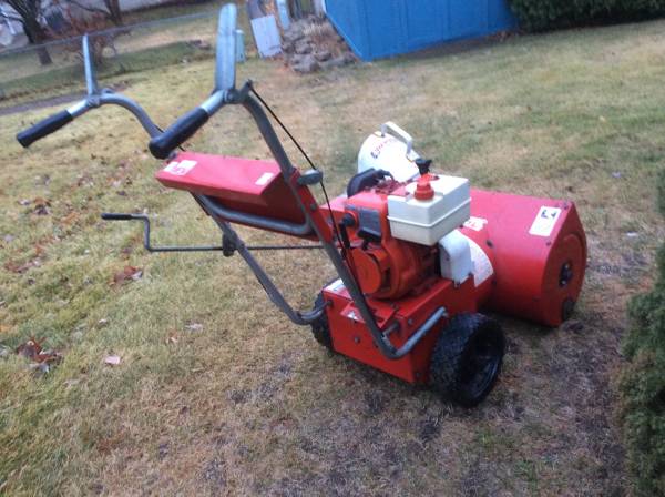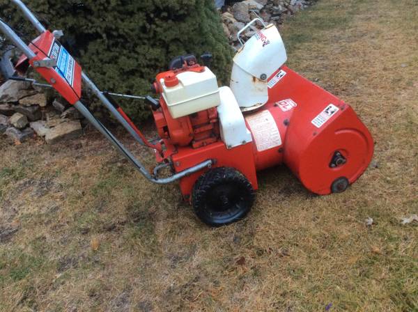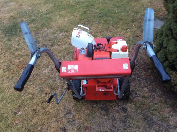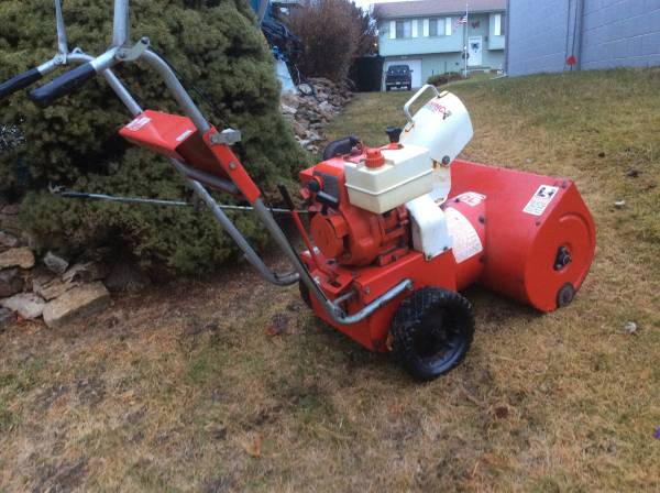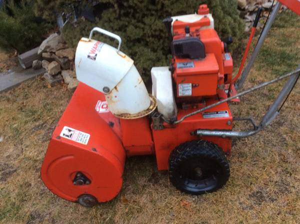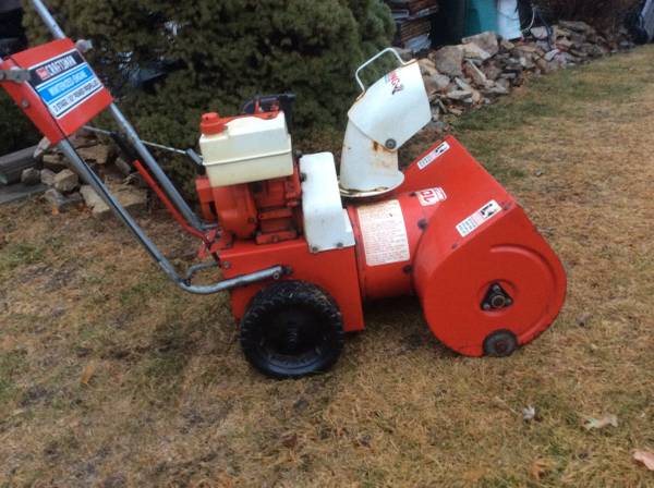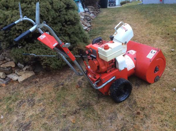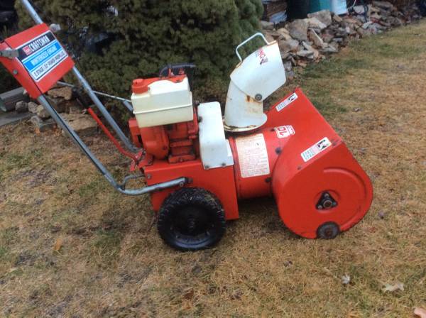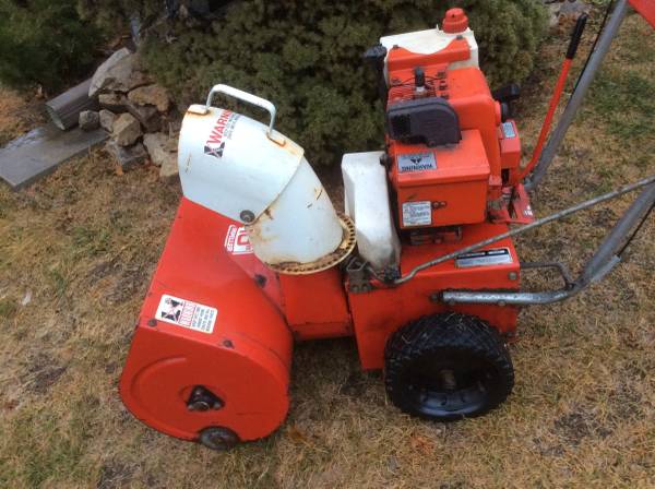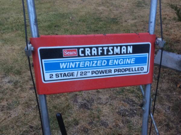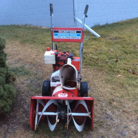 Sears 2 stage snow blower with 5 HP engine 3 forward and 1 reverse drive. Has lever to move snow chute 180 degrees and handle bars have lever to engage blades and other to engage drive to move snow blower forward or backwards. 10 inch impelled chute.