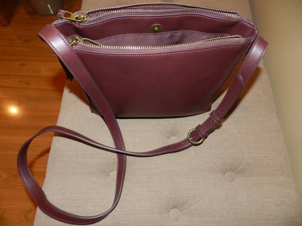 Faux Leather Crossbody Medium Purse - Burgundy (Universal Thread) - Two Zipper Sections on Outside along w Snap Closure on Middle Section. Length 27" and Width 8". Excellent Condition - Asking...
