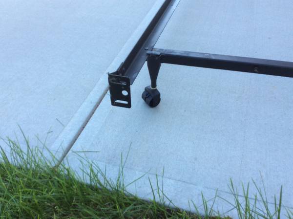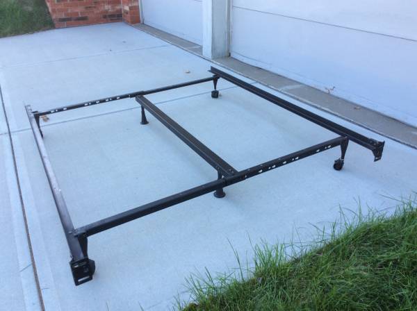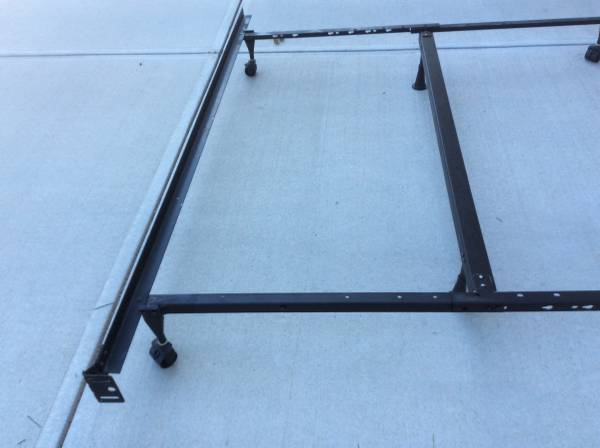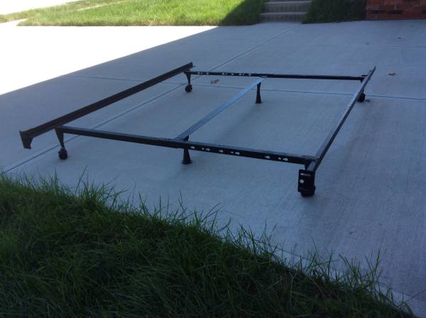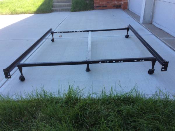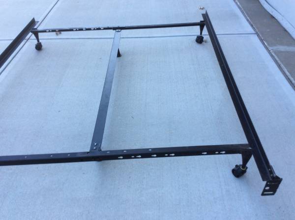 Bed frame is adjustable to fit queen full or twin beds. Has center support bar with 2 support posts. Head board attachments also.